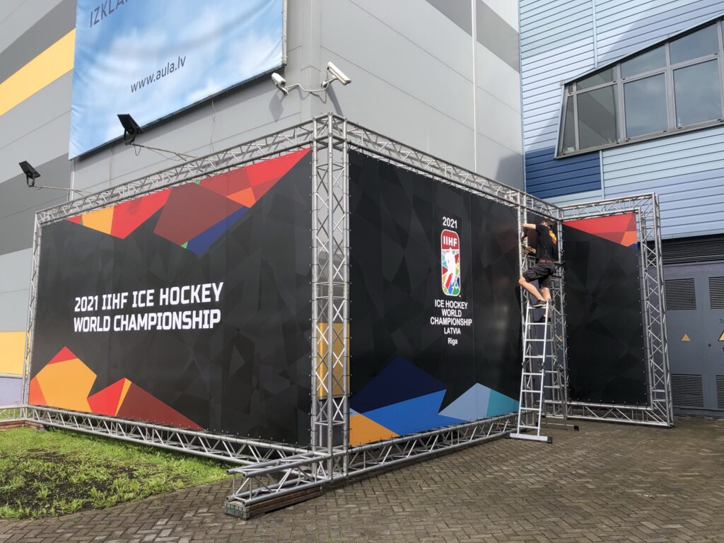 IIHF Pasaules čempionāts hokejā 2021 Uzdevums Ēkas fasādes trūkumu slēpšana ieejas brendings spēlētāju ieejai hokeja hallē. Risinājums Izmantojot alumīnija konstrukciju tiek veidota brīvi stāvoša siena, kuras plaknēs iestiepjam lielformāta baneri.