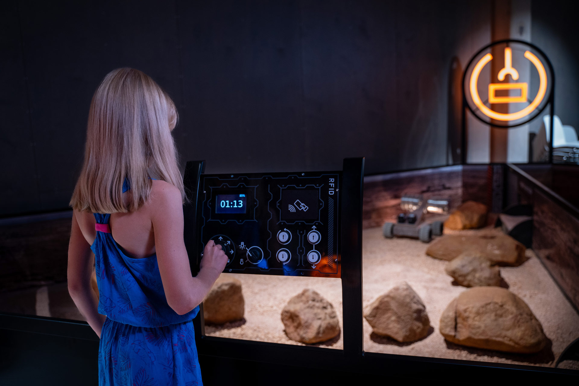 3D CAD vidē tiek izstrādāts robota modelis. Robota funkcionalitāti nodrošina uzdevumam atbilstoši programmētas elektromehānikas daļas. Robots vadāms ar tālvadības pulti un pieeja tā vadībai iespējama izmantojot apmeklētājiem izdalītas RFid kartes.
