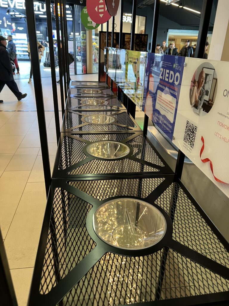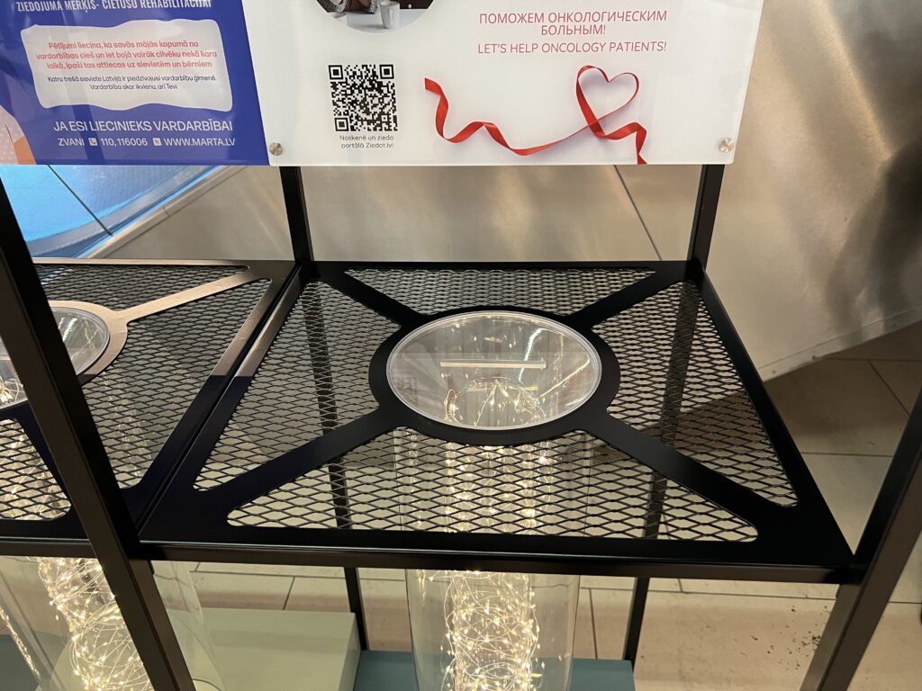 Izstrādājām unikāla dizaina stendu, piedomājot par tā funkcionalitāti un drošību. Stends atrodas publiskā telpā pašā Rīgas centrā tāpēc drošības dēļ, saziedotie naudas līdzekļi krājas no augšpuses slēgtās organiskā stikla caurulēs. Saziedotie līdzekļi izgaismoti izmantojot dekoratīvu LED apgaismojumu.